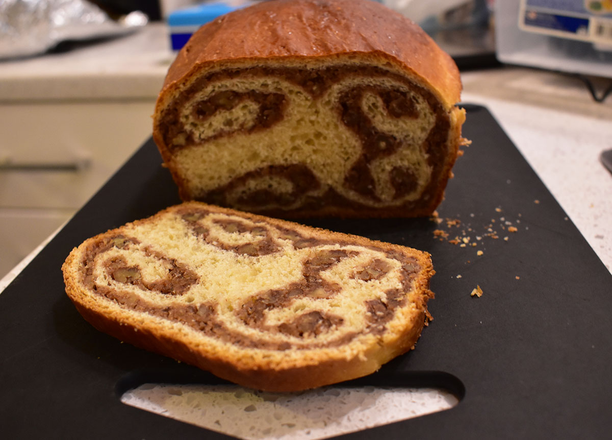 From what I understand, the kind of authentic bread that my friend pines for (however it’s spelled) has much thinner layers – and is thereby a much bigger pain in the ass. So, make no mistake, I don’t think this particular iteration of marbled pecan bread is any specific kind of regional delicacy. I think it’s an approximation that tastes good and isn’t too much hassle, which is definitely enough for me.