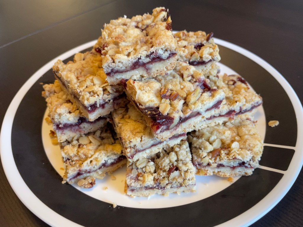 Got a jar of jam you’ve been wanting to make use of? Got some butter and flour and sugar and oats? You’re pretty much all set!